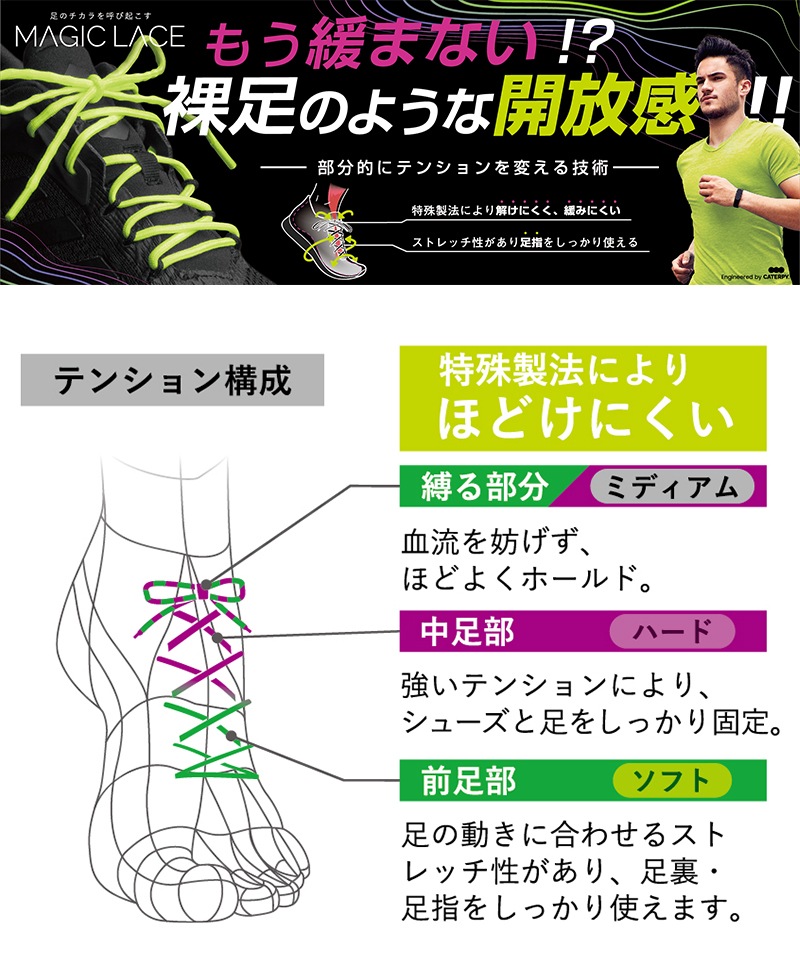 マジックレースは紐の伸縮率を部位に合わせて変えることにより、これらの問題を軽減し、足の本来の力を引き出します。