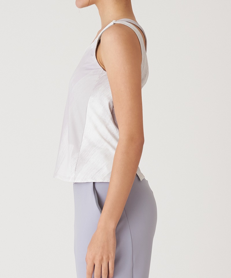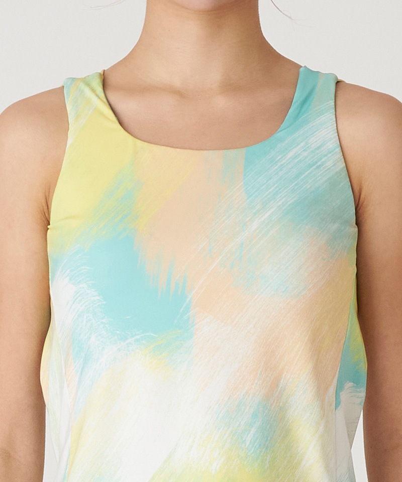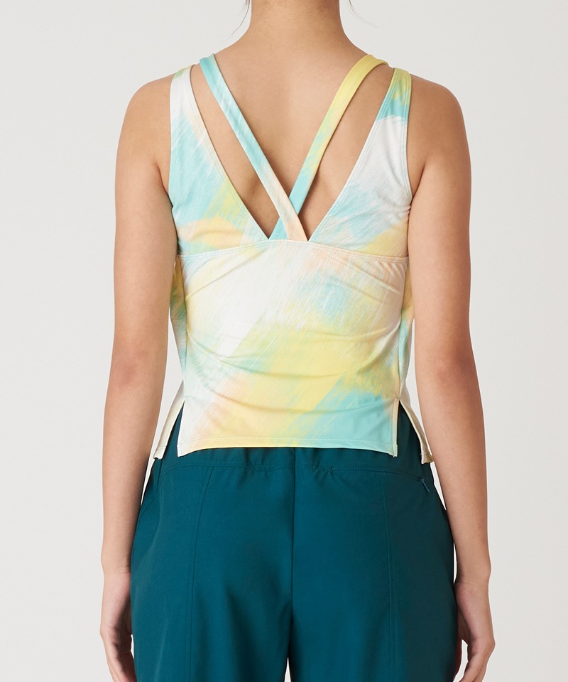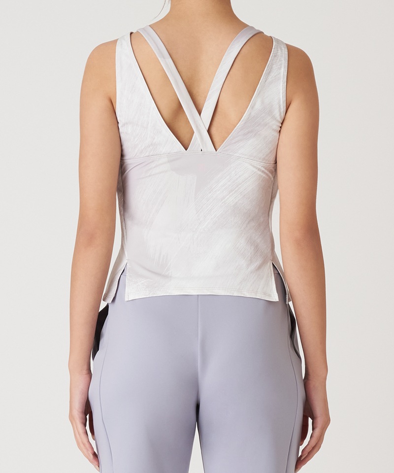 背中のクロスストラップがアクセントのロングトップ。