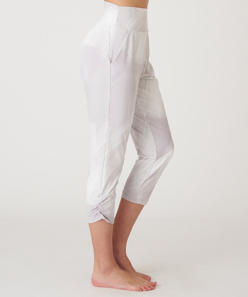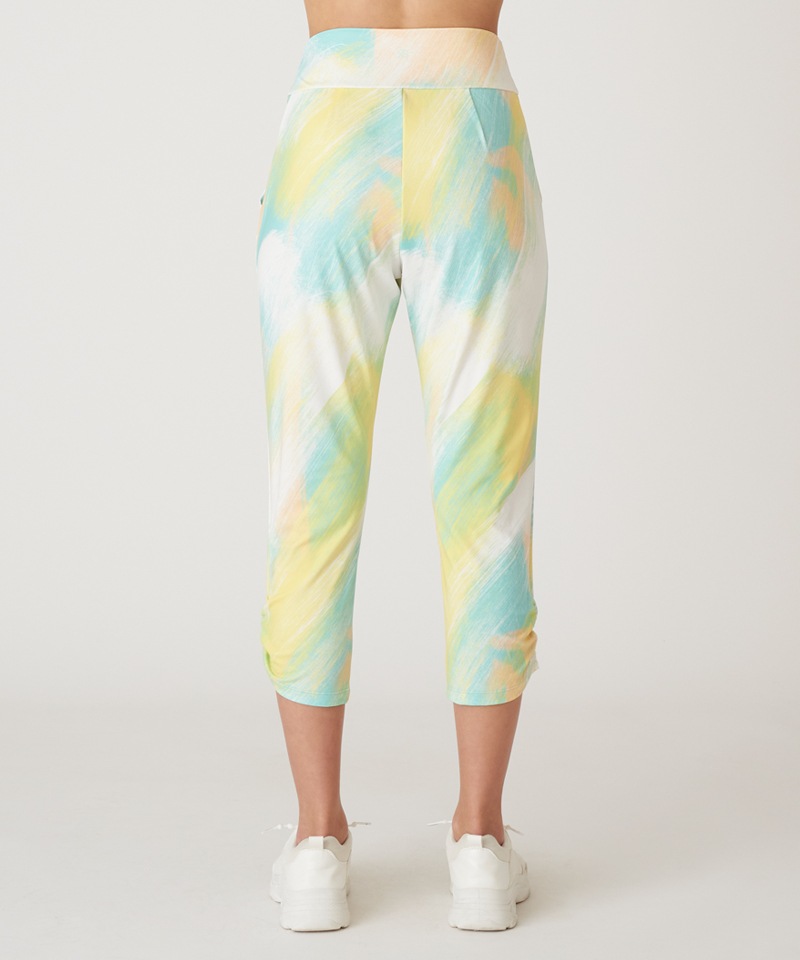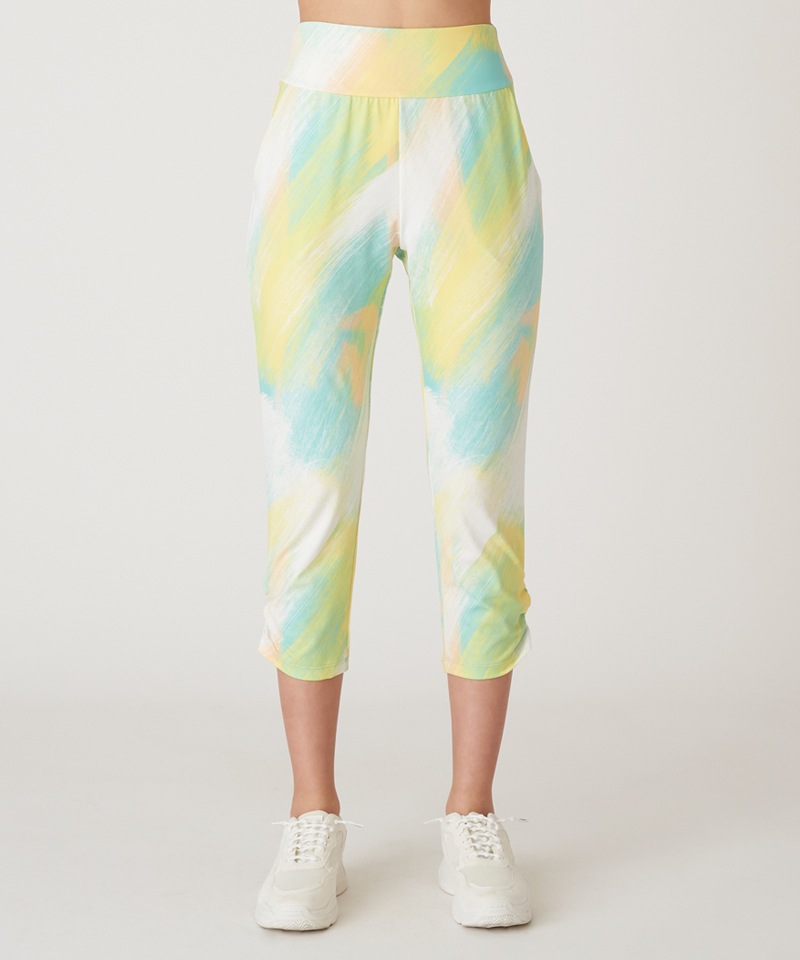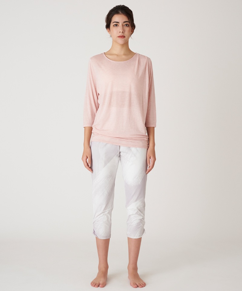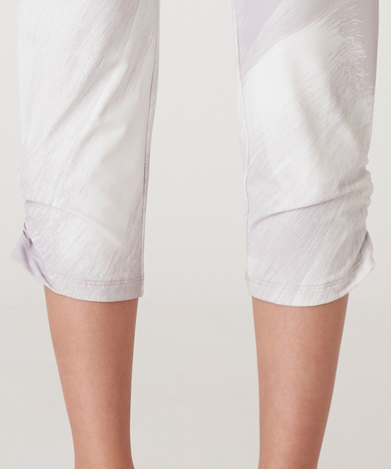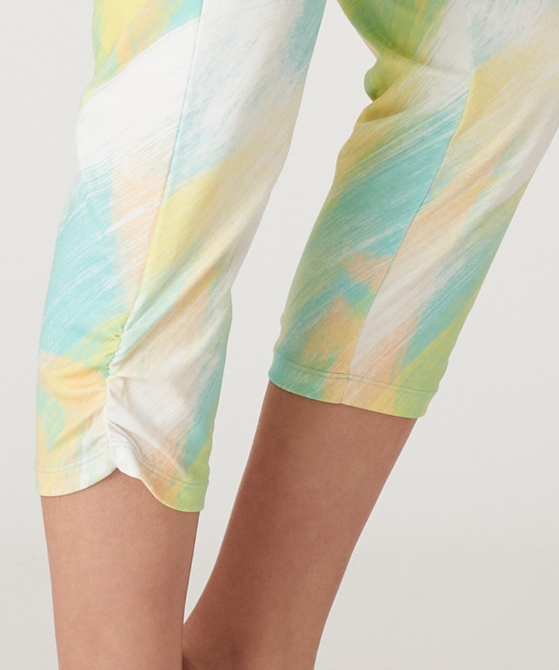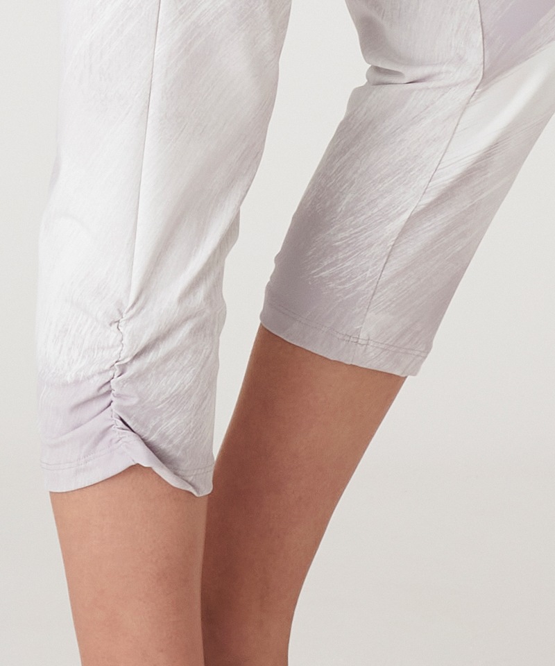 両サイド裾のギャザーがアクセントのカプリ丈パンツ。