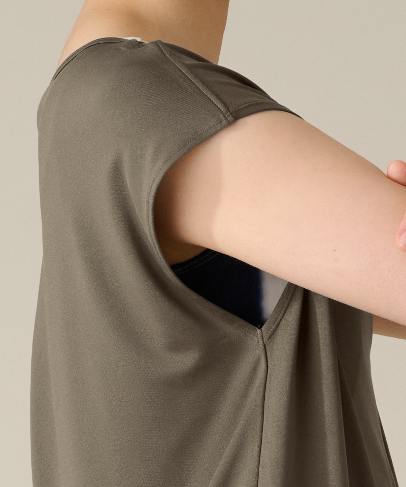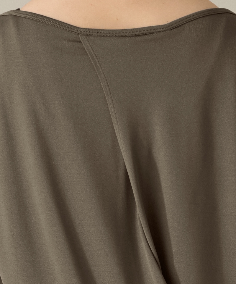 シンプルながら、動くたび、身頃の隙間からインナーや肌が覗き見える抜け感のあるバックスタイルが魅力の1着。