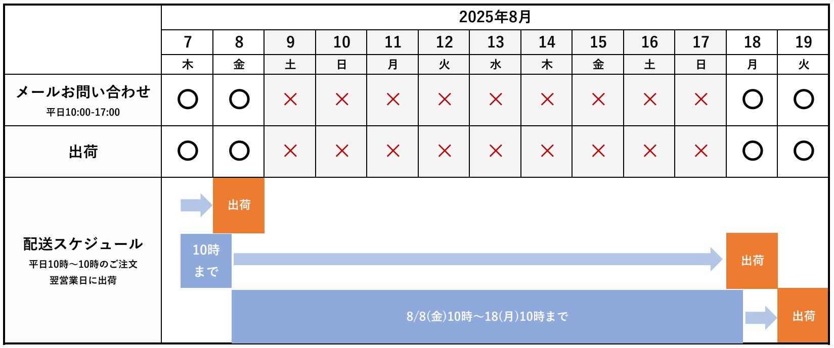 2025年8月9日(土)~8月17日(日)の配送スケジュールについて