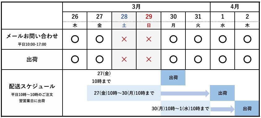 2026年3月27日(金)午前10時~4月1日(水)午前10時にご注文の商品出荷について